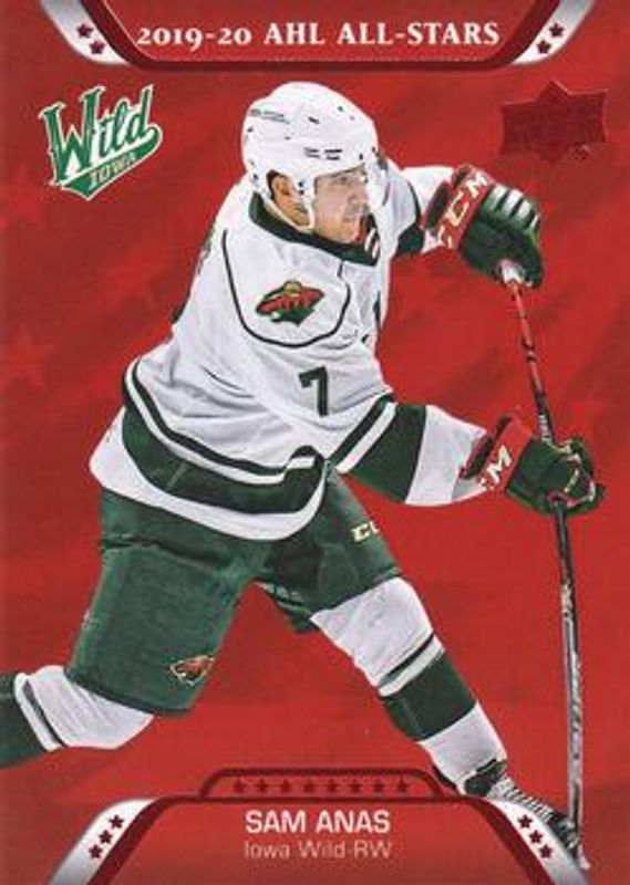 The Sam Anas 2020 Upper Deck AHL #213 Red card is 1 of 4 Sam Anas' card variations in the 2020 Upper Deck AHL set being tracked by Sports Card Investor, including Base, Gold /25, and Autographs.