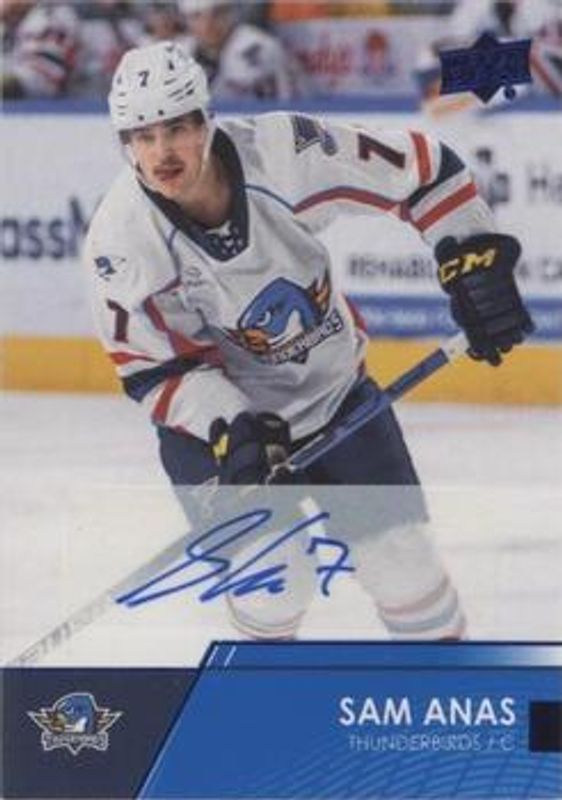 The Sam Anas 2021 Upper Deck AHL #25 Autographs card is 1 of 9 Sam Anas' card variations in the 2021 Upper Deck AHL set being tracked by Sports Card Investor, including Base, Exclusives /100, High Gloss /10, Blue, and Printing Plates - Black /1.
