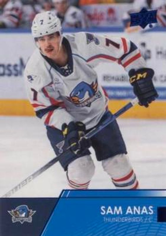 The Sam Anas 2021 Upper Deck AHL #25 Blue card is 1 of 9 Sam Anas' card variations in the 2021 Upper Deck AHL set being tracked by Sports Card Investor, including Base, Exclusives /100, High Gloss /10, Autographs, and Printing Plates - Black /1.