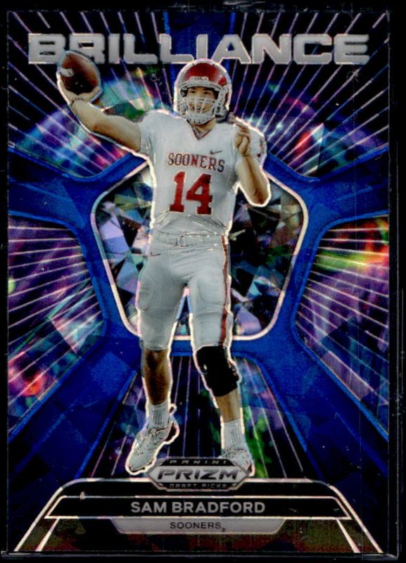 The Sam Bradford 2024 Prizm Draft Picks #BR-SB Brilliance - Blue Ice /99 card is 1 of 8 Sam Bradford's card variations in the 2024 Prizm Draft Picks set being tracked by Sports Card Investor, including Brilliance, Brilliance - White Sparkle /(SSP), Brilliance - Orange Pulsar /49, Brilliance - Mojo /25, and Brilliance - Gold /10.