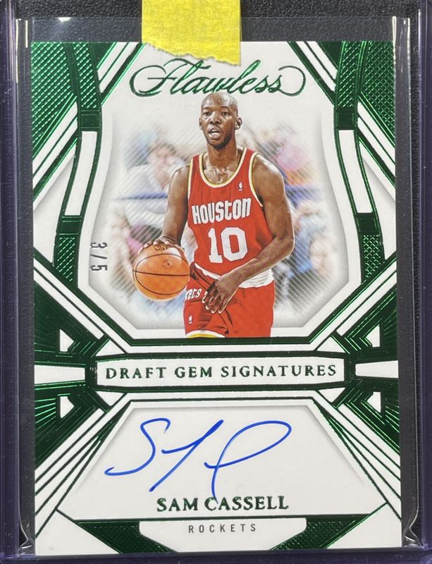 The Sam Cassell 2023 Flawless #DGS-SAM Draft Gem Signatures - Emerald /5 card is 1 of 14 Sam Cassell's card variations in the 2023 Flawless set being tracked by Sports Card Investor, including Draft Gem Signatures /25, Legendary Scripts /25, Draft Gem Signatures - Ruby /15, Legendary Scripts - Ruby /15, and Draft Gem Signatures - Gold /10.
