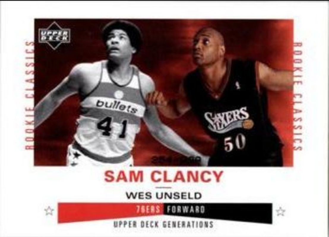 The Sam Clancy 2002 Upper Deck Generations #232 Base /999 Rookie card is 1 of 2 Sam Clancy's card variations in the 2002 Upper Deck Generations set being tracked by Sports Card Investor, including Base /999.