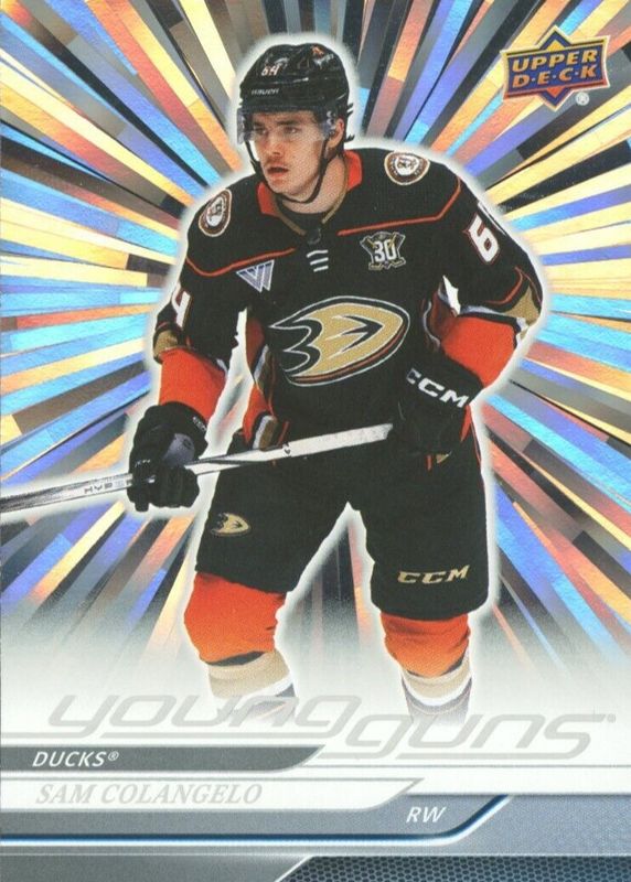 This card is 1 of 8 Sam Colangelo's card variations in the 2024 Upper Deck set being tracked by Sports Card Investor, including Young Guns Base, Young Guns - Clear Cut, Young Guns - Deluxe /250, Young Guns - UD Exclusives /100, and Young Guns - Outburst Red /25.
