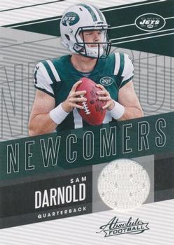 The Sam Darnold 2018 Absolute #NC-SD Newcomers Rookie card is 1 of 17 Sam Darnold's card variations in the 2018 Absolute set being tracked by Sports Card Investor, including Base, Introductions, Introductions - Spectrum Gold, Rookie Dual - Memorabilia, and Rookie Force.