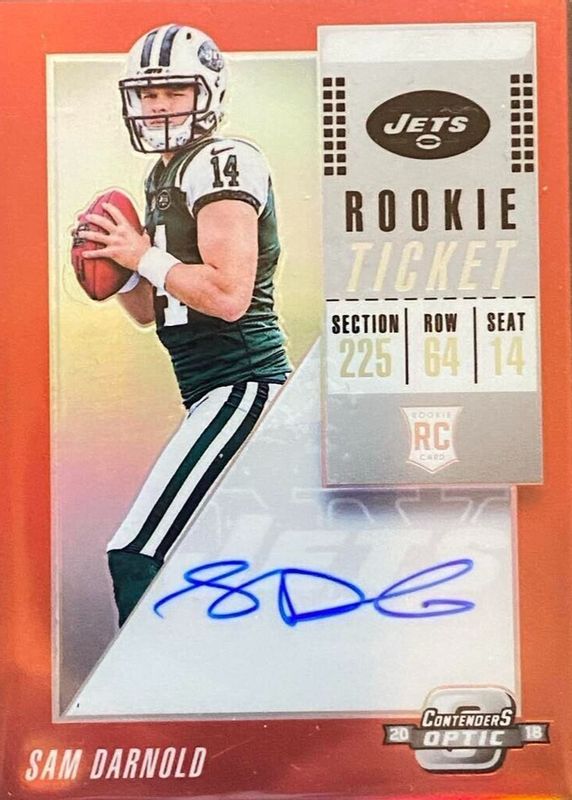 This card is 1 of 7 Sam Darnold's card variations in the 2018 Contenders Optic set being tracked by Sports Card Investor, including Rookie Ticket Auto, Rookie Ticket Auto - Blue (/15), Rookie Ticket Auto - Orange (/25), Rookie Ticket Auto - Purple (/49), and Rookie Ticket Auto - Gold /10.