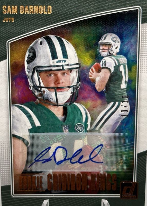 The Sam Darnold 2018 Donruss #RGK-1 Rookie Gridiron Kings Autographs (/10) card in Raw condition has not changed in price in the last 30 days and was last sold for $60.00 .