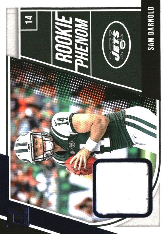 The Sam Darnold 2018 Donruss #1 Rookie Phenom Jerseys - Blue card in Raw condition has not changed in price in the last 30 days and was last sold for $9.87 .