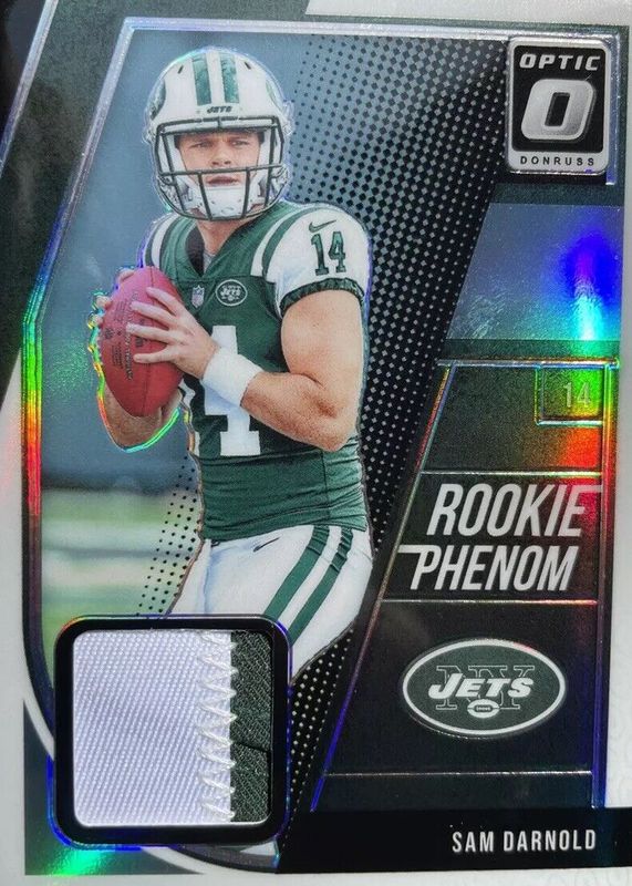 The Sam Darnold 2018 Optic #RP-SD Rookie Phenom Jerseys Vertical - Prime /50 card in Raw condition has not changed in price in the last 30 days and was last sold for $33.99 .