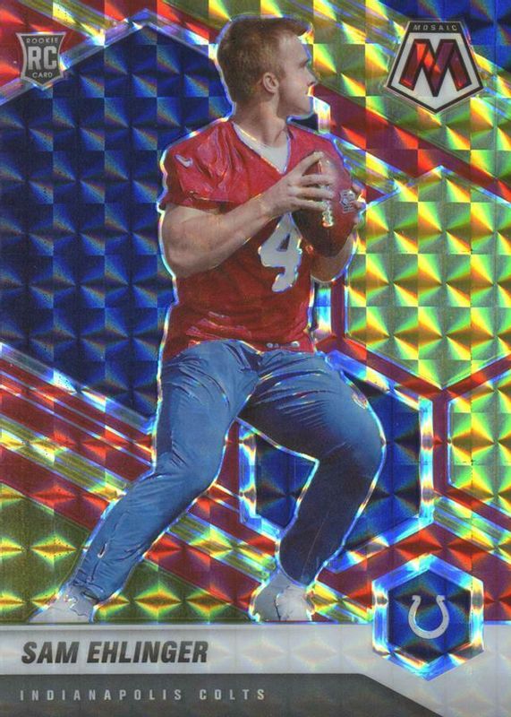 This card is 1 of 37 Sam Ehlinger's card variations in the 2021 Mosaic set being tracked by Sports Card Investor, including Base, Choice Red & Green, Green, No Huddle, and Pink Camo.