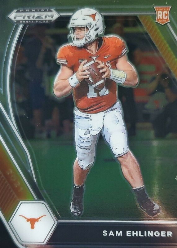 This card is 1 of 7 Sam Ehlinger's card variations in the 2021 Prizm Draft Picks set being tracked by Sports Card Investor, including Green, Purple Wave, Silver, Color Blast /(SSP), and On Campus /(SSP).