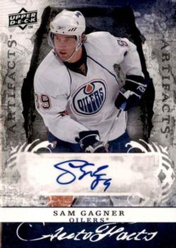 The Sam Gagner 2008 Upper Deck Artifacts #AF-SG Auto Facts card is 1 of 11 Sam Gagner's card variations in the 2008 Upper Deck Artifacts set being tracked by Sports Card Investor, including #177 Base /999, #59 Base /999, #177 Blue /50, #59 Blue /50, and #59 Copper Spectrum /25.