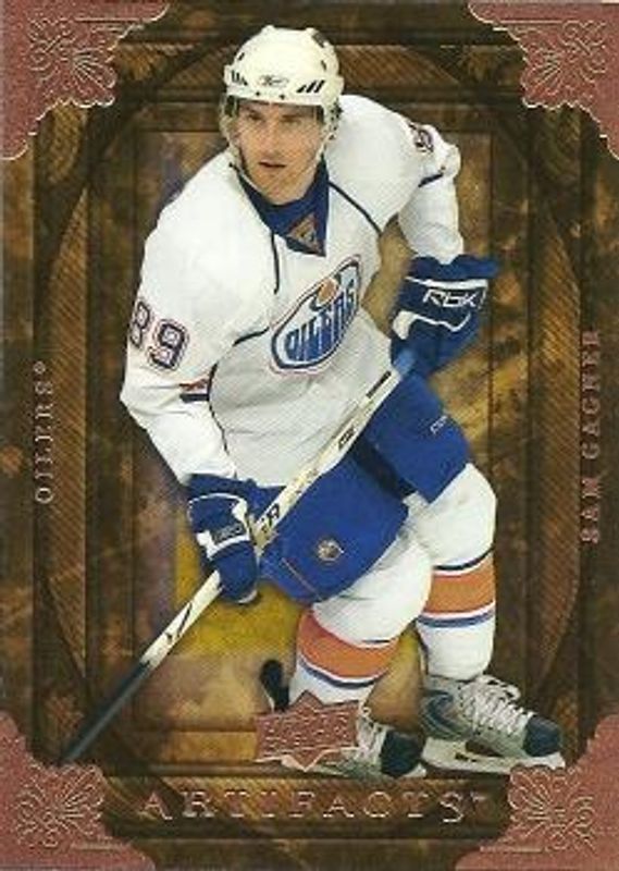 The Sam Gagner 2008 Upper Deck Artifacts #59 Base /999 card is 1 of 11 Sam Gagner's card variations in the 2008 Upper Deck Artifacts set being tracked by Sports Card Investor, including #177 Base /999, #177 Blue /50, #59 Blue /50, #59 Copper Spectrum /25, and #177 Copper Spectrum /25.
