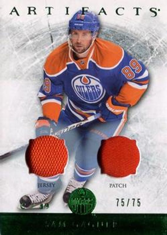 The Sam Gagner 2012 Upper Deck Artifacts #55 Jersey Patch - Emerald /75 card is 1 of 21 Sam Gagner's card variations in the 2012 Upper Deck Artifacts set being tracked by Sports Card Investor, including Base /699, Emerald /99, Sapphire /85, Gold Spectrum /25, and Black /5.