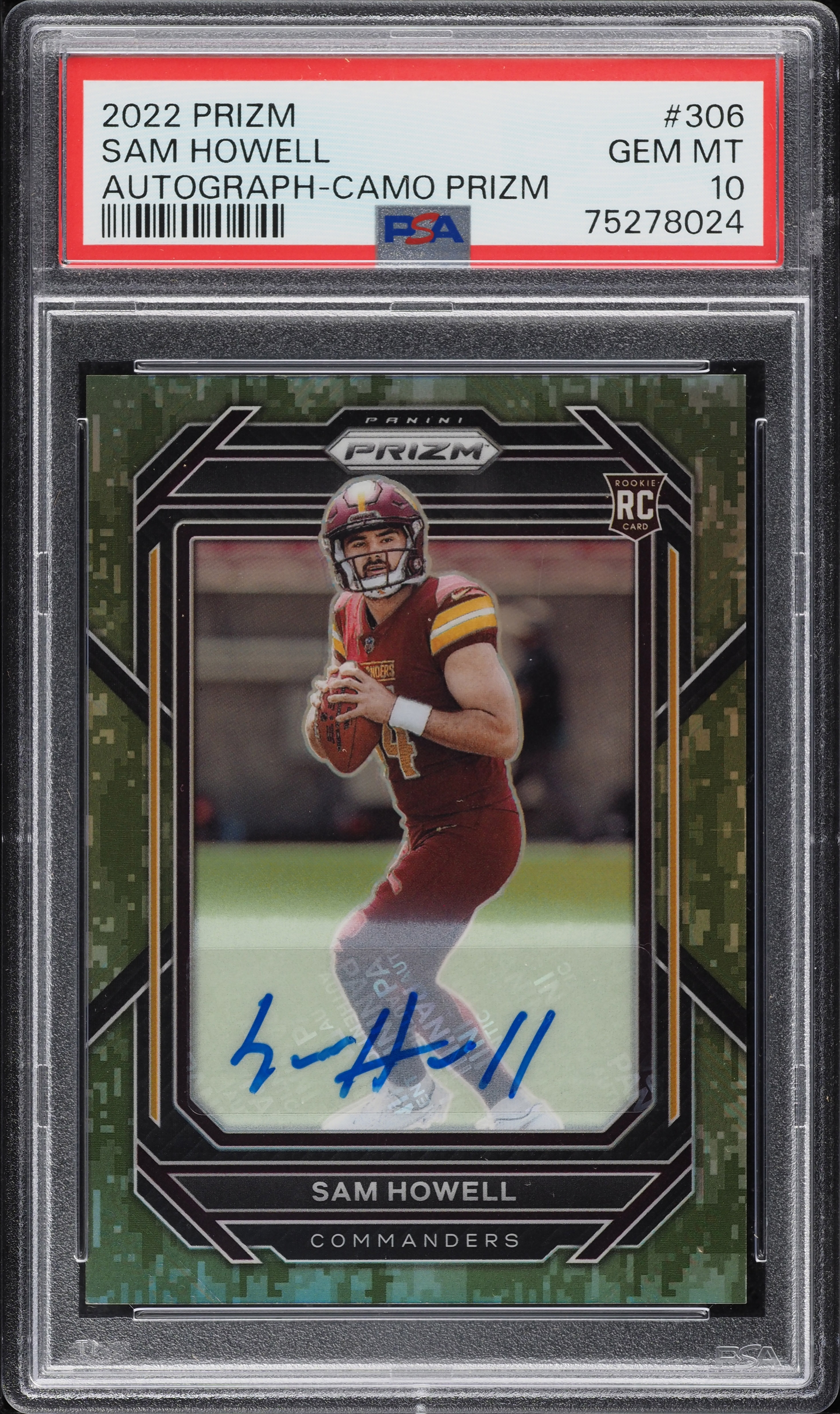 The Sam Howell 2022 Prizm #306 Rookie Autographs - Camo /25 card in Raw condition has not changed in price in the last 30 days and was last sold for $169.49 .