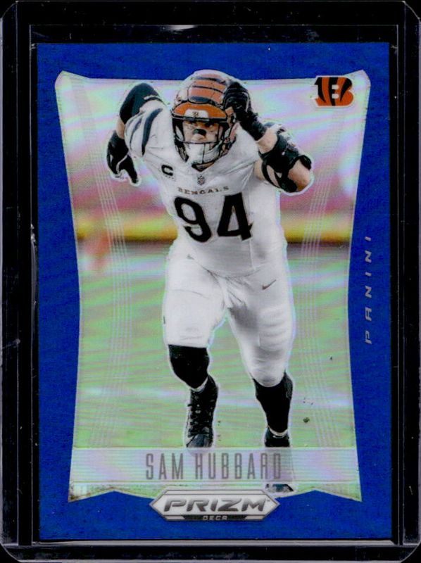 The Sam Hubbard 2024 Prizm Deca #61 Blue /149 card is 1 of 13 Sam Hubbard's card variations in the 2024 Prizm Deca set being tracked by Sports Card Investor, including Base, Silver, Red /199, Purple /99, and Orange /49.