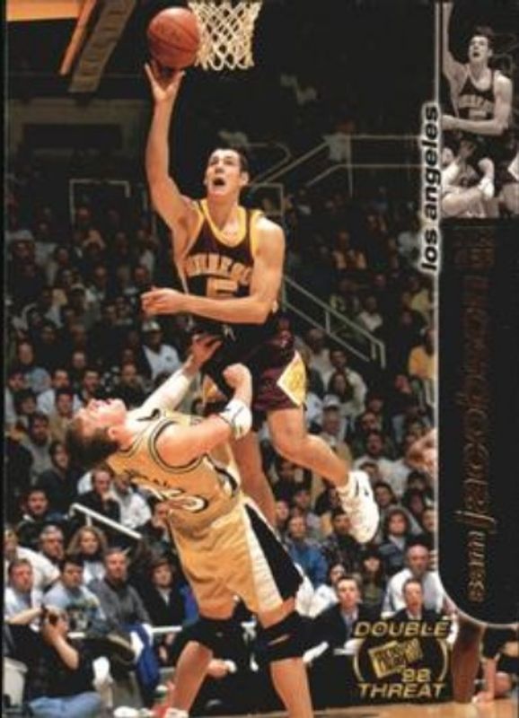 The Sam Jacobson 1998 Press Pass Double Threat #20 Base Rookie card is 1 of 5 Sam Jacobson's card variations in the 1998 Press Pass Double Threat set being tracked by Sports Card Investor, including Alley Oop, Torquers, Retros, and Rookie Script Autographs.