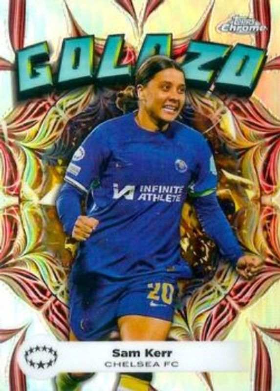 The Sam Kerr 2023 Topps Chrome UEFA Women's Champions League #GZ-4 Golazo card is 1 of 33 Sam Kerr's card variations in the 2023 Topps Chrome UEFA Women's Champions League set being tracked by Sports Card Investor, including Base, Aqua Prism, Pulsar, Refractor, and XI.