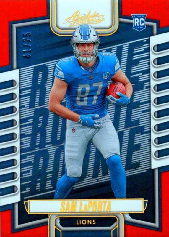 This card is 1 of 17 Sam LaPorta's card variations in the 2023 Absolute set being tracked by Sports Card Investor, including Base, Red Squares /499, Orange Mosaic /299, Spectrum /275, and Blue Diamonds /199.