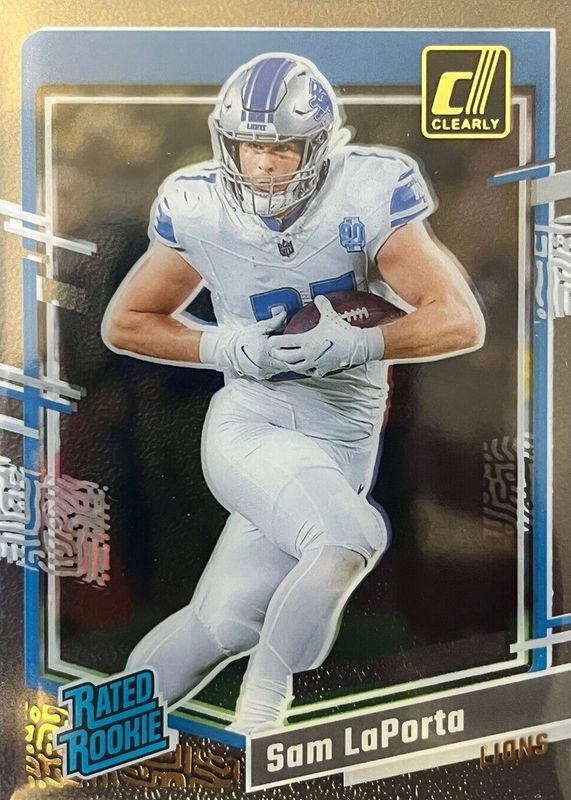 This card is 1 of 15 Sam LaPorta's card variations in the 2023 Clearly Donruss set being tracked by Sports Card Investor, including Base, Holo Mosaic, Holo Rated Rookie Logo, Purple /199, and Blue /99.