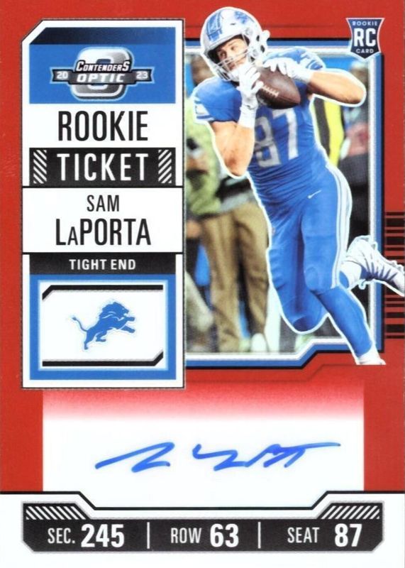 The Sam LaPorta 2023 Contenders Optic #131 Rookie Ticket Auto - Red (/125) card in Raw condition has not changed in price in the last 30 days and was last sold for $36.00 .