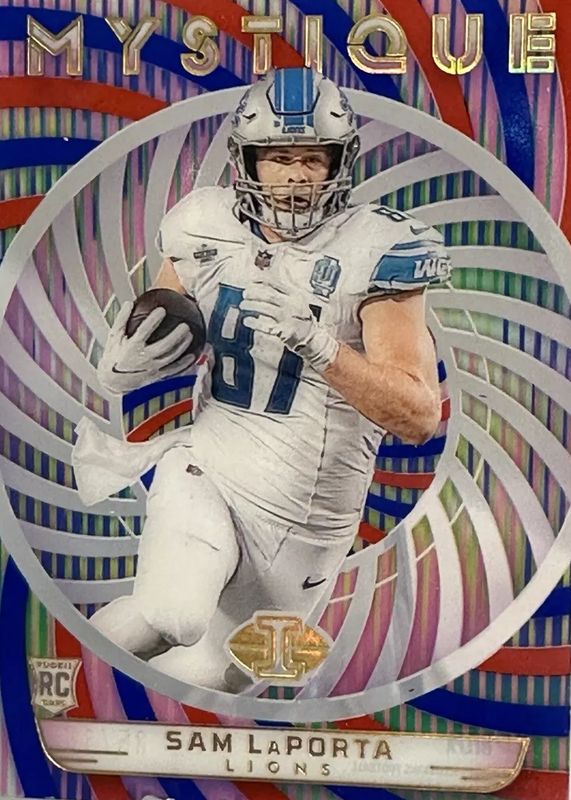 The Sam LaPorta 2023 Illusions #31 Mystique - Red & Blue /15 Rookie card in Raw condition has not changed in price in the last 30 days and was last sold for $27.50 .