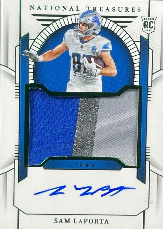 The Sam LaPorta 2023 National Treasures #187 Rookie Patch Auto - Green Jersey Number (/87) card in Raw condition has not changed in price in the last 30 days and was last sold for $122.50 .