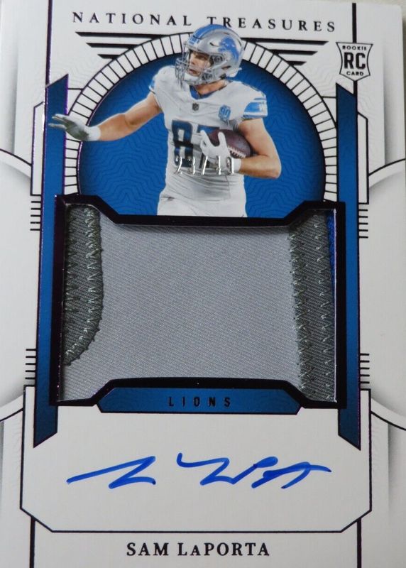 The Sam LaPorta 2023 National Treasures #187 Rookie Patch Auto - Purple /49 card in Raw condition has not changed in price in the last 30 days and was last sold for $99.15 .