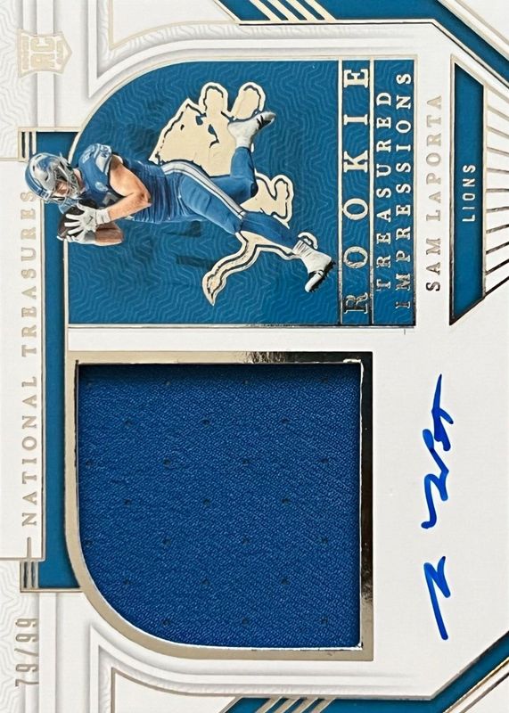 The Sam LaPorta 2023 National Treasures #TI-SLA Rookie Treasured Impressions /99 card in Raw condition has not changed in price in the last 30 days and was last sold for $51.01 .