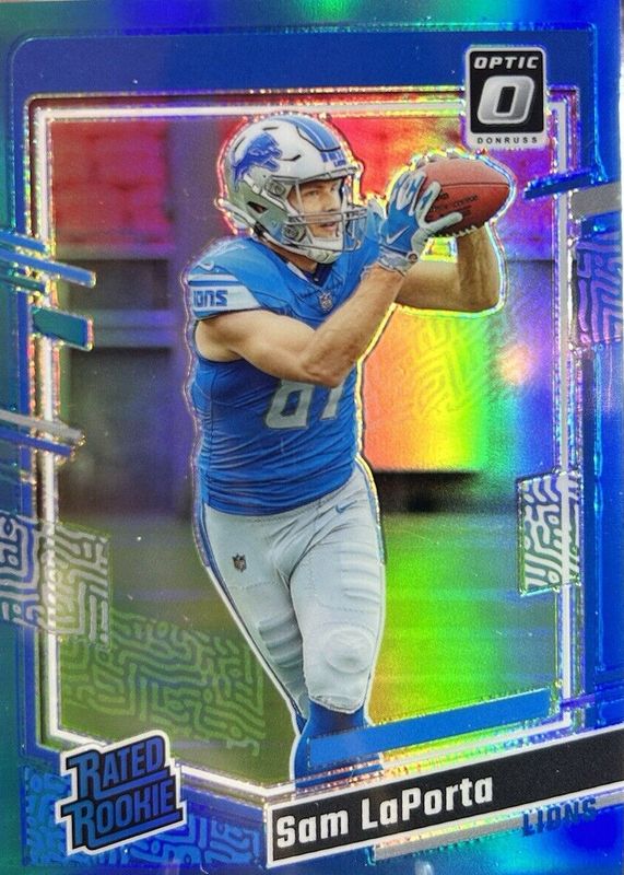 This card is 1 of 53 Sam LaPorta's card variations in the 2023 Optic set being tracked by Sports Card Investor, including Base, Blue Hyper, Blue Scope, Green Hyper, and Green Velocity.