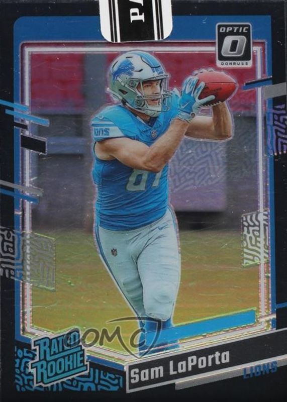 This card is 1 of 53 Sam LaPorta's card variations in the 2023 Optic set being tracked by Sports Card Investor, including Base, Blue Hyper, Blue Scope, Green Hyper, and Green Velocity.