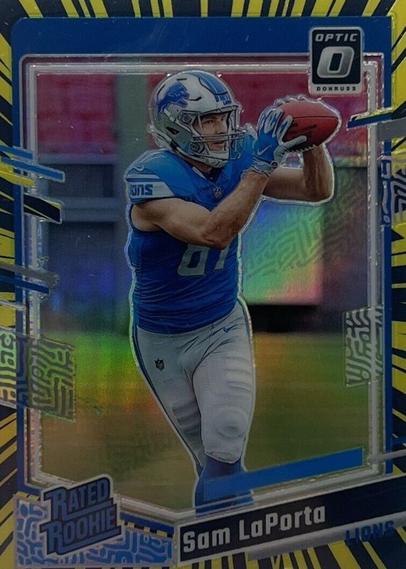 The Sam LaPorta 2023 Optic #237 Electricity /69 Rookie card in Raw condition has not changed in price in the last 30 days and was last sold for $27.51 .