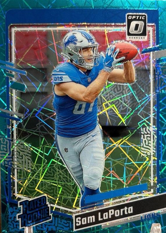 The Sam LaPorta 2023 Optic #237 Teal Velocity Rookie card in Raw condition has not changed in price in the last 30 days and was last sold for $5.50 .