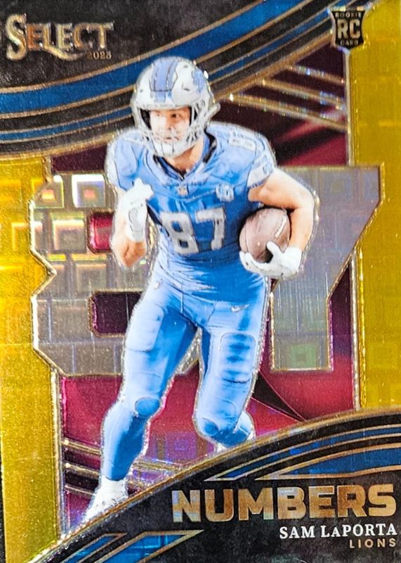 The Sam LaPorta 2023 Select #NMB-SLA Select Numbers - Gold /10 Rookie card in Raw condition has not changed in price in the last 30 days and was last sold for $49.99 .
