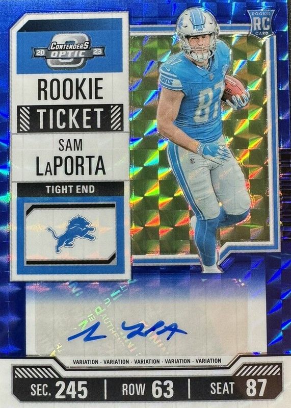 The Sam LaPorta 2023 Zenith #117 Contenders Optic Rookie Ticket Auto Preview - Blue /23 (Ball in Right Hand) card in Raw condition has not changed in price in the last 30 days and was last sold for $260.00 .
