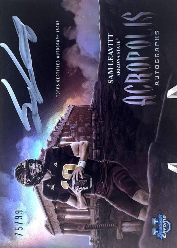 The Sam Leavitt 2025 Bowman Chrome University #AA-SL Acropolis Autographs /99 card in Raw condition has moved up $5.50 (+11.7%) in the last 30 days and was last sold for $52.50 .