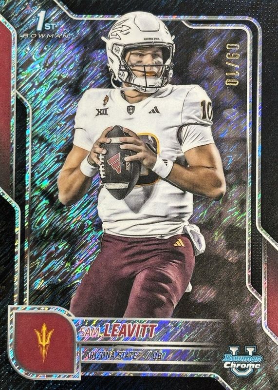 This card is 1 of 63 Sam Leavitt's card variations in the 2025 Bowman Chrome University set being tracked by Sports Card Investor, including Base (1st), Pink Lava Refractor (1st), Refractor (1st), Shimmer Refractor (1st), and Stealth Refractor (1st).