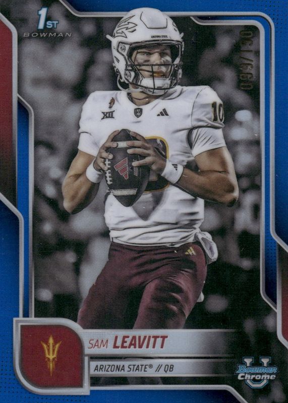 The Sam Leavitt 2025 Bowman Chrome University #195 Blue Refractor /150 (1st) card in Raw condition has moved up $3.99 (+99.0%) in the last 30 days and was last sold for $8.02 .
