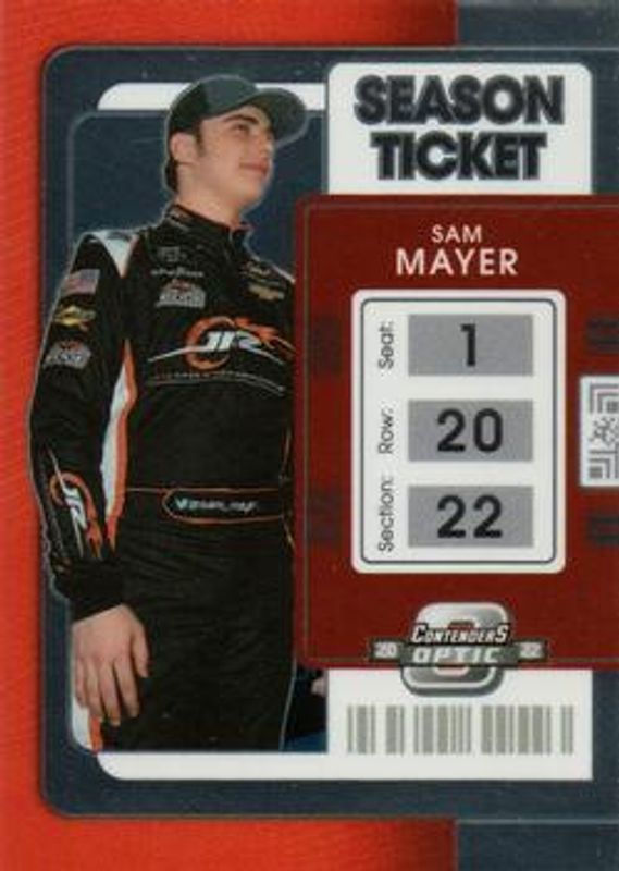 The Sam Mayer 2022 Chronicles NASCAR #20 Contenders Optic card is 1 of 41 Sam Mayer's card variations in the 2022 Chronicles NASCAR set being tracked by Sports Card Investor, including Absolute, Absolute Autographs, Contenders Optic Autographs, Contenders Optic Green, and Contenders Optic Holo.