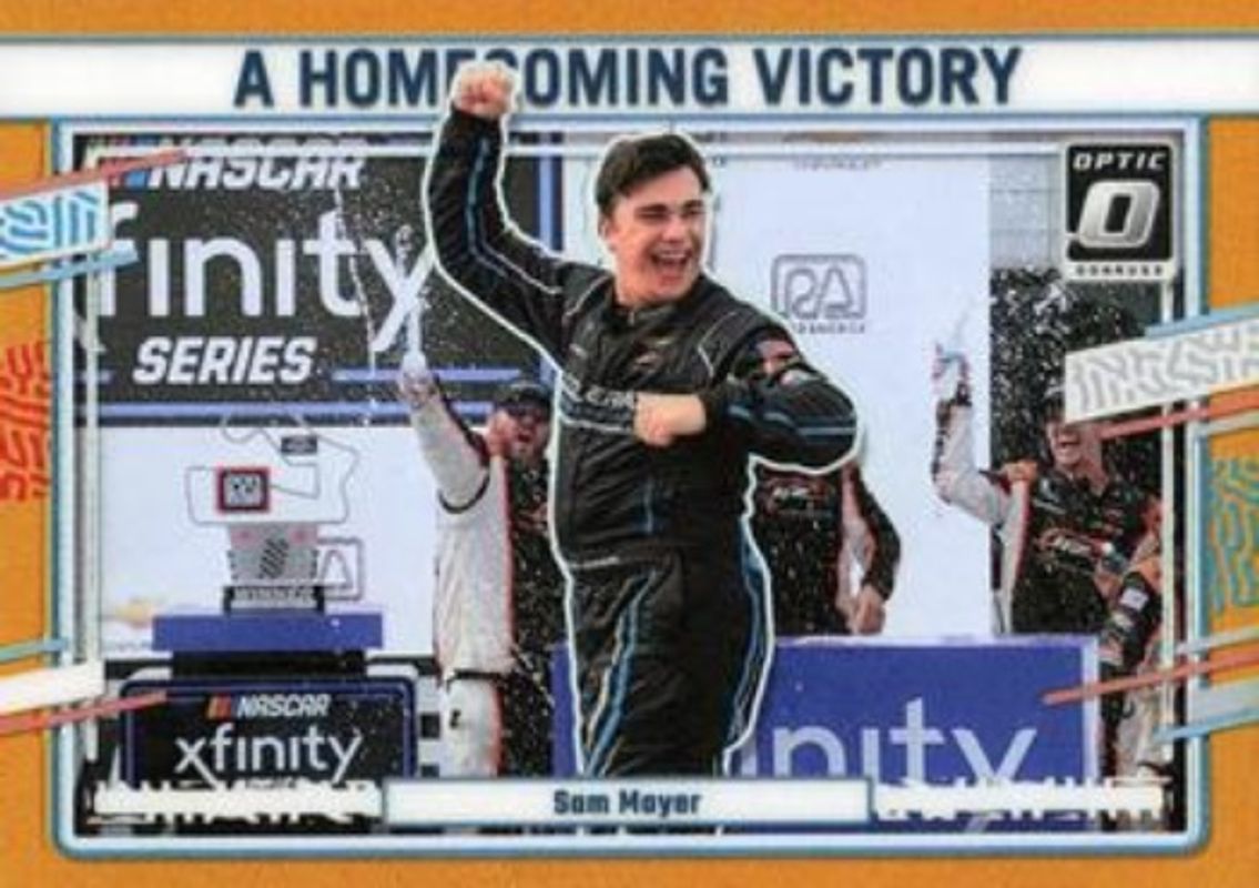 The Sam Mayer 2024 Donruss NASCAR #180 Optic Gold /10 card is 1 of 116 Sam Mayer's card variations in the 2024 Donruss NASCAR set being tracked by Sports Card Investor, including #146 Base, #180 Base, #25 Base, #146 Optic, and #180 Optic.