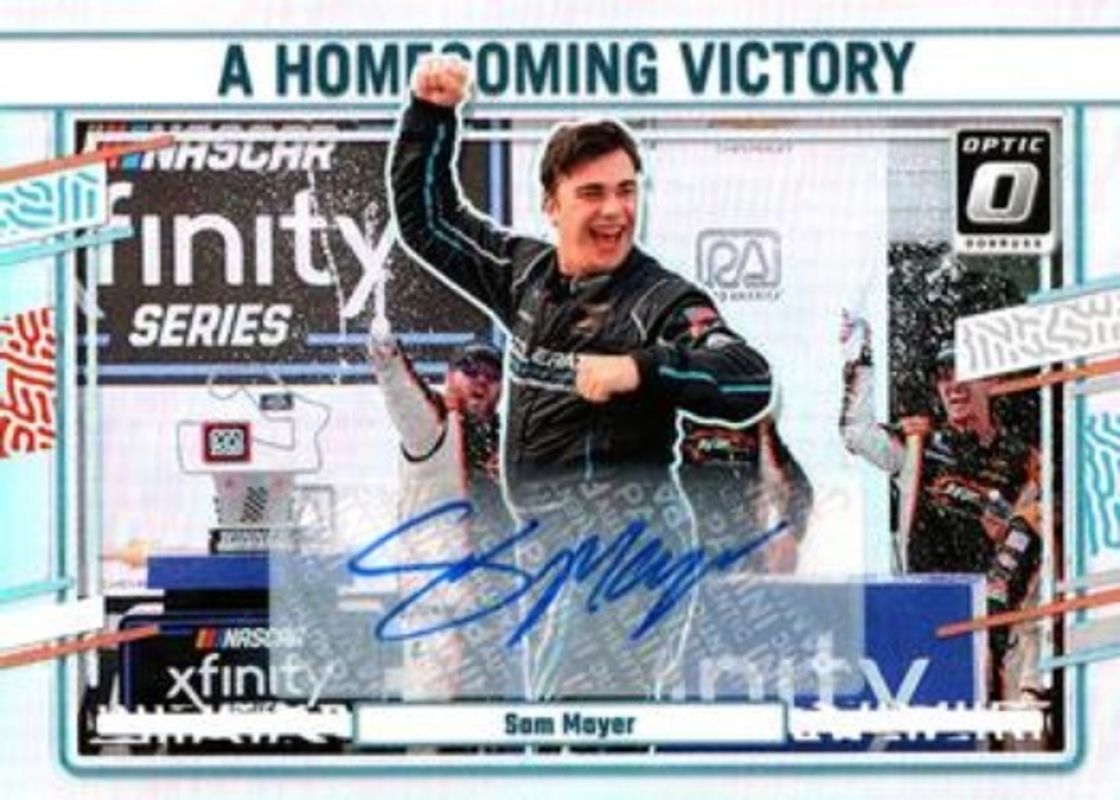 The Sam Mayer 2024 Donruss NASCAR #180 Optic Signatures card is 1 of 116 Sam Mayer's card variations in the 2024 Donruss NASCAR set being tracked by Sports Card Investor, including #146 Base, #180 Base, #25 Base, #146 Optic, and #180 Optic.