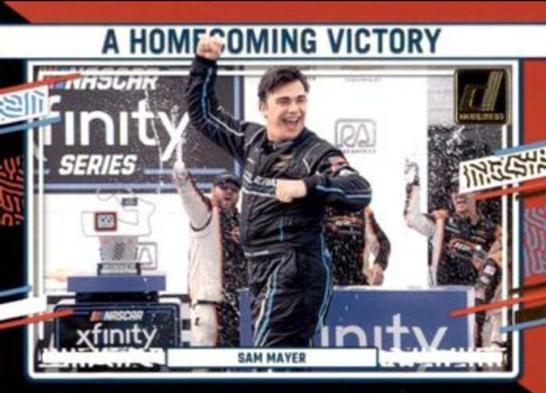 The Sam Mayer 2024 Donruss NASCAR #180 Red & Blue card is 1 of 116 Sam Mayer's card variations in the 2024 Donruss NASCAR set being tracked by Sports Card Investor, including #146 Base, #180 Base, #25 Base, #146 Optic, and #180 Optic.