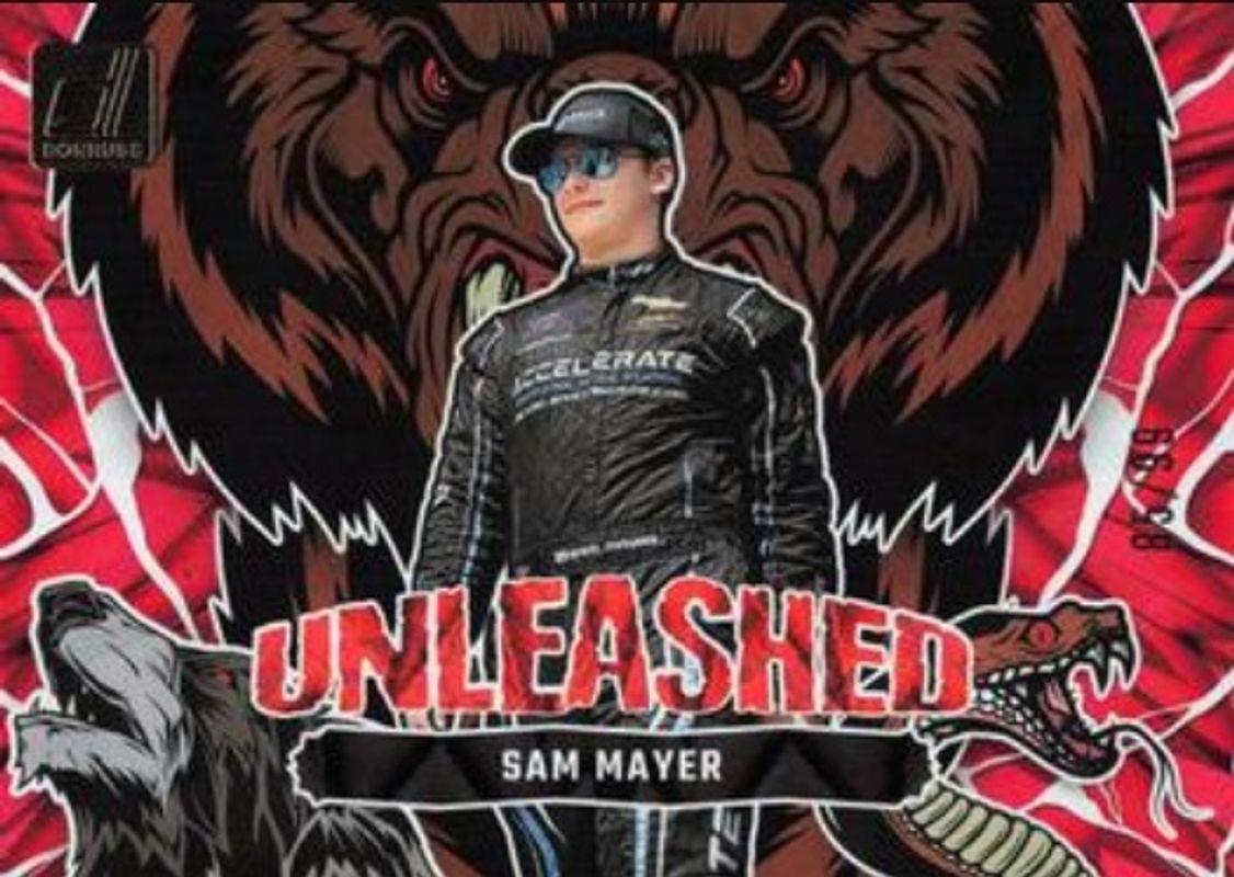The Sam Mayer 2024 Donruss NASCAR #14 Unleashed Red Xplosion /99 card is 1 of 116 Sam Mayer's card variations in the 2024 Donruss NASCAR set being tracked by Sports Card Investor, including #146 Base, #180 Base, #25 Base, #146 Optic, and #180 Optic.