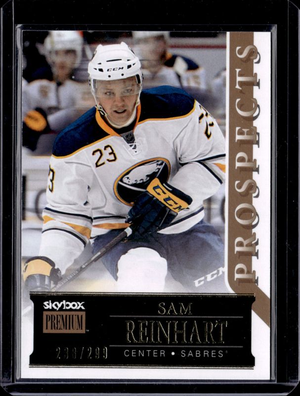 The Sam Reinhart 2014 Fleer Showcase #39 Skybox Premium /299 Rookie card is 1 of 16 Sam Reinhart's card variations in the 2014 Fleer Showcase set being tracked by Sports Card Investor, including Base /399, Precious Metal Gems Blue /100, Red Glow /27, White Hot /9, and Flair Showcase.