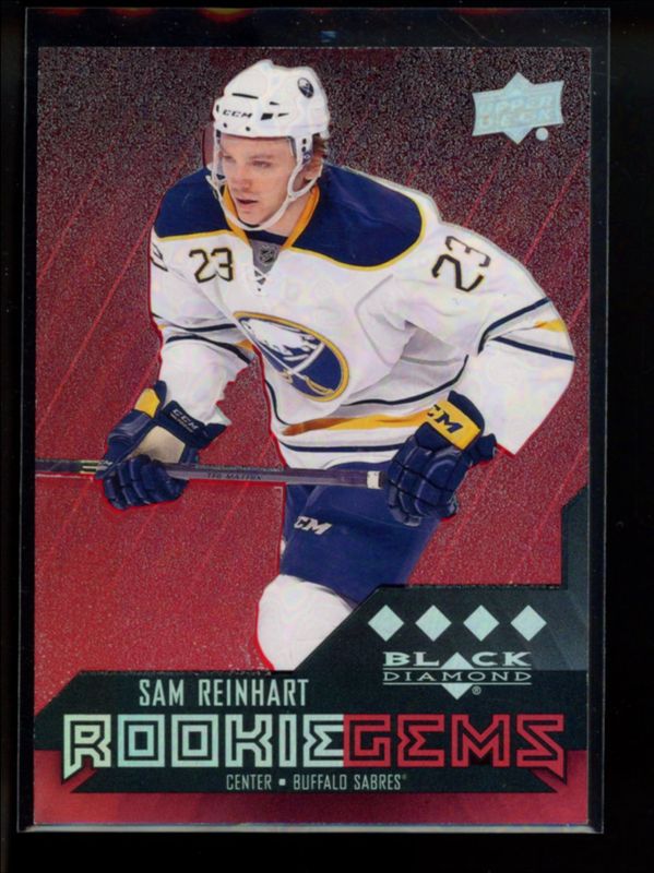 The Sam Reinhart 2014 Upper Deck Black Diamond #226 Ruby /50 Rookie card is 1 of 7 Sam Reinhart's card variations in the 2014 Upper Deck Black Diamond set being tracked by Sports Card Investor, including Base, Orange, Emerald /10, Sapphire /1, and UD Black Lustrous Rookies Previews.