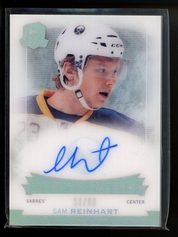 The Sam Reinhart 2014 Upper Deck The Cup #E-SR Enshrinements /99 Rookie card is 1 of 84 Sam Reinhart's card variations in the 2014 Upper Deck The Cup set being tracked by Sports Card Investor, including Base /249, Artist Proof Limited Logos, Gold Spectrum Autographs /25, Gold /10, and Gold Foil /10.