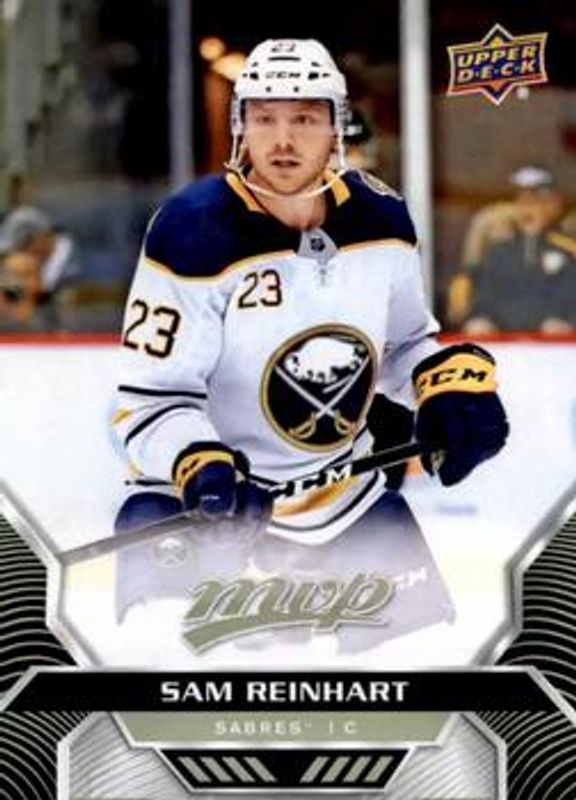 The Sam Reinhart 2020 Upper Deck MVP #14 Base card is 1 of 19 Sam Reinhart's card variations in the 2020 Upper Deck MVP set being tracked by Sports Card Investor, including Blue, Gold Script, Puzzle Backs, Silver Script, and Super Script /25.