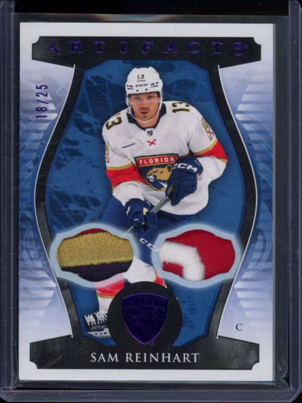 The Sam Reinhart 2023 Upper Deck Artifacts #14 Material - Purple /15 card is 1 of 23 Sam Reinhart's card variations in the 2023 Upper Deck Artifacts set being tracked by Sports Card Investor, including Base /999, Turquoise, Ruby /499, Copper /299, and Royal Blue /199.