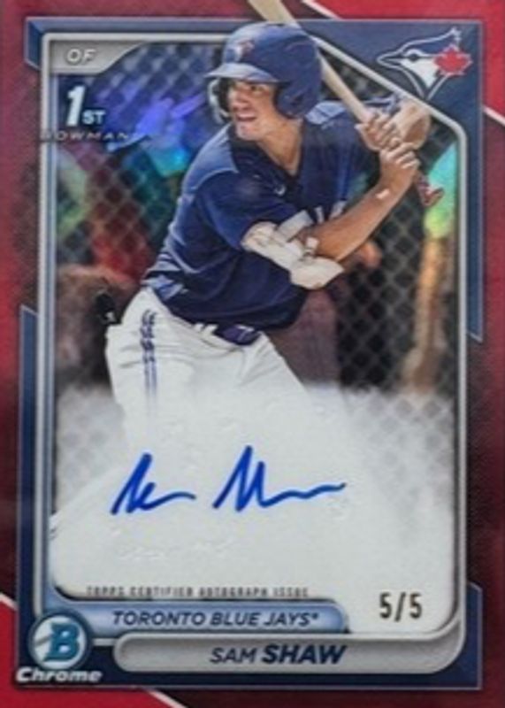 Auctions Ending Soon for Sam Shaw 2024 Bowman #CPA-SS Chrome Prospect Auto - Red Refractor /5 (1st) RAW