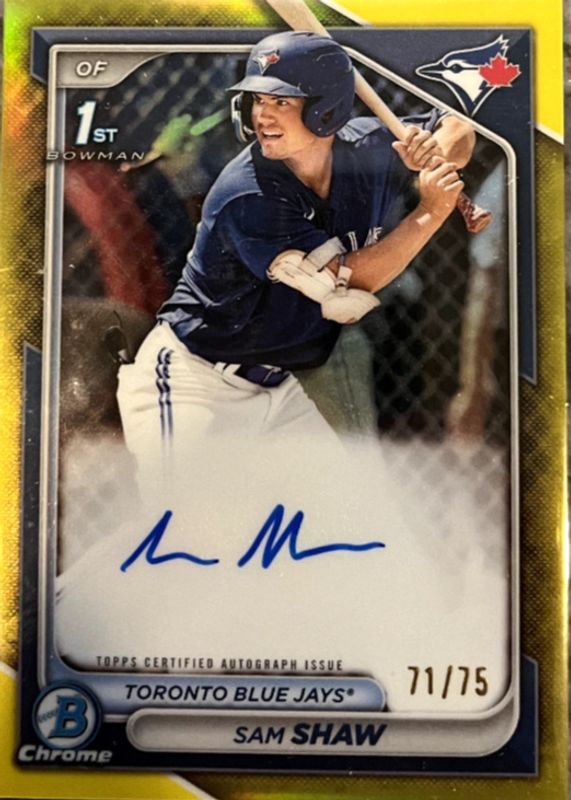 2024 Bowman Sam Shaw Chrome Auto Yellow Refractor 1st Prospect #/75 Blue Jays