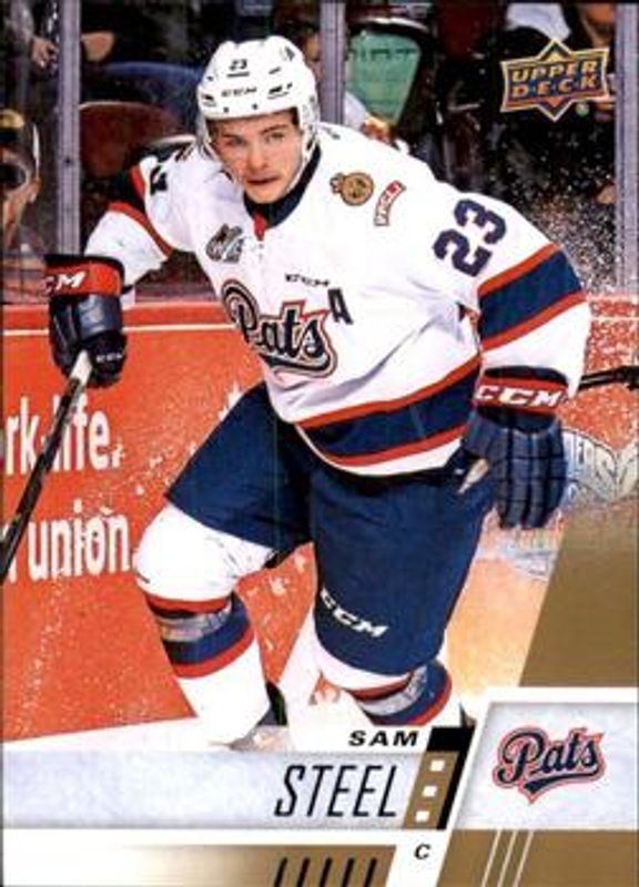 The Sam Steel 2017 Upper Deck CHL #22 Base card is 1 of 9 Sam Steel's card variations in the 2017 Upper Deck CHL set being tracked by Sports Card Investor, including Rainbow, Red Bordered, Printing Plates Black /1, Printing Plates Cyan /1, and Printing Plates Magenta /1.